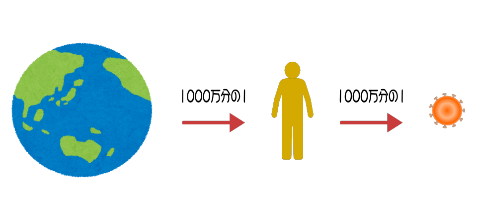 目を転じてヒトと地球(直径約12800キロメートル)のサイズを比較すると、ヒトは地球の約1000万分の1になります。